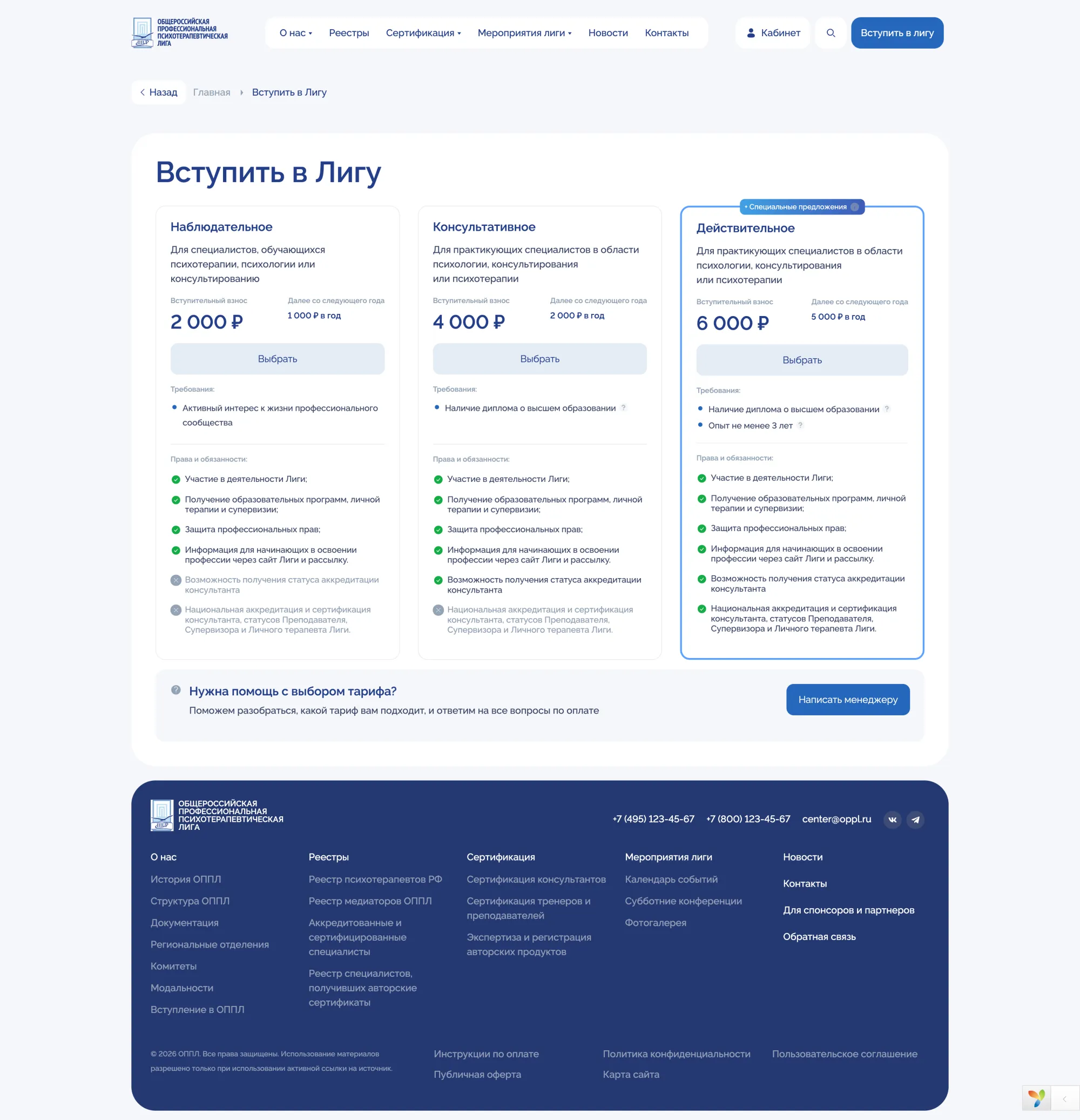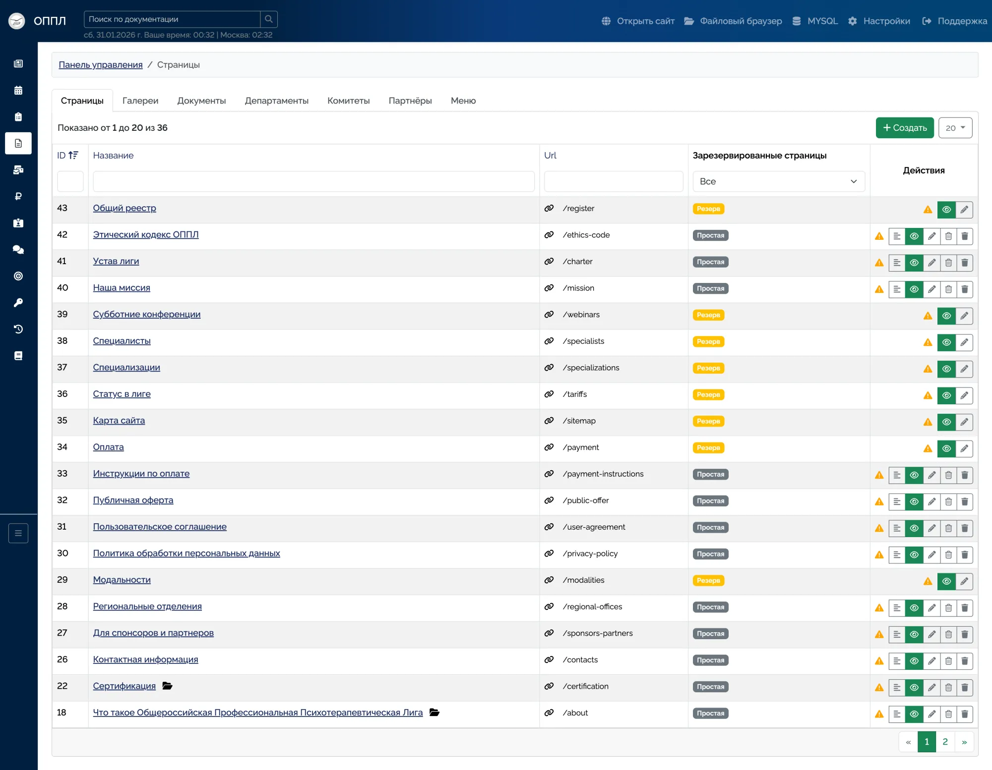 Full CRUD management for all site entities: news, publications, events, registries, users, pricing plans, documents, and galleries.