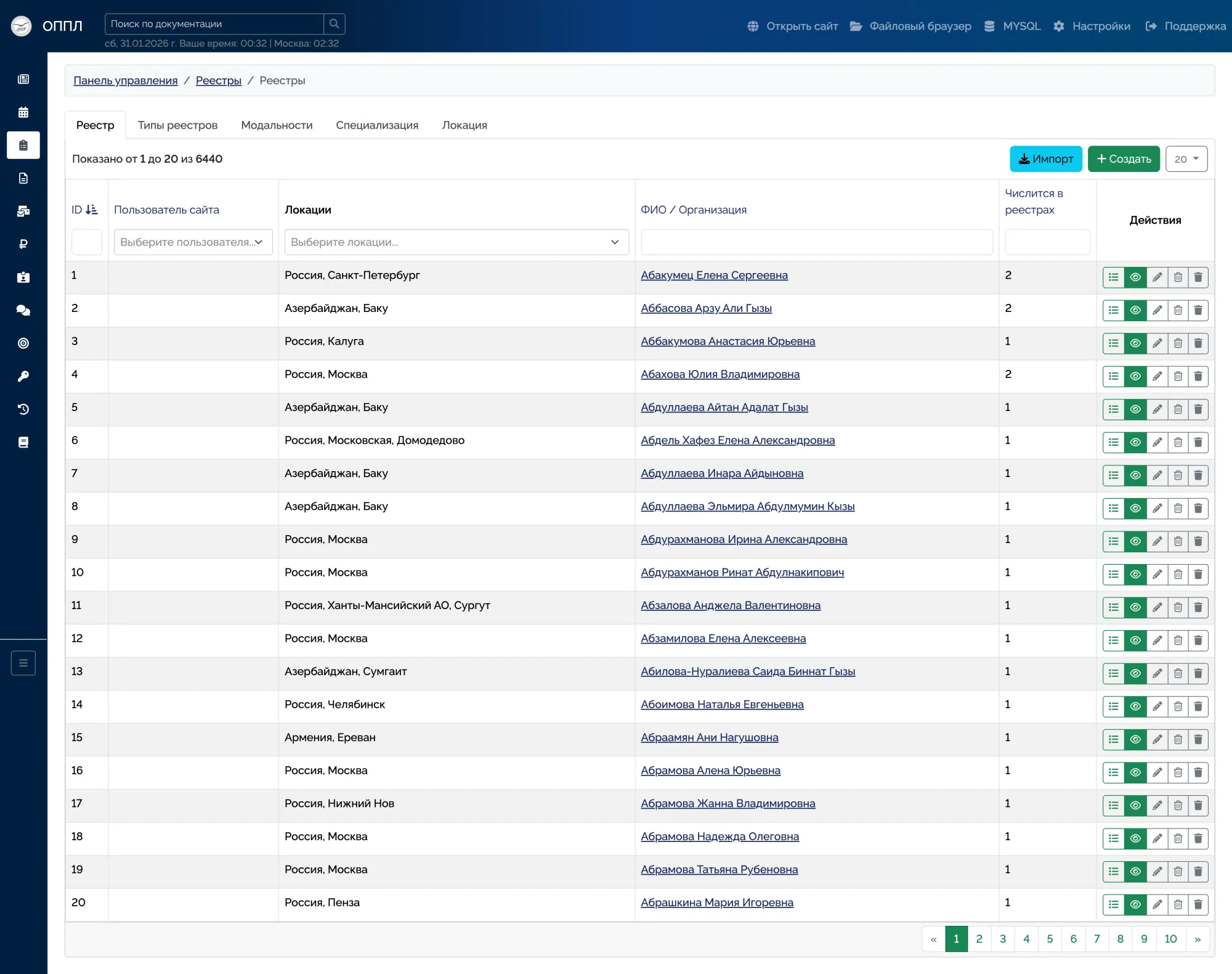 Multi-level registry system with types, modalities, specializations, and geographic locations.