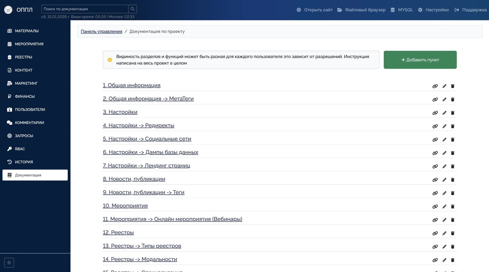 Administrator activity history and internal project documentation.