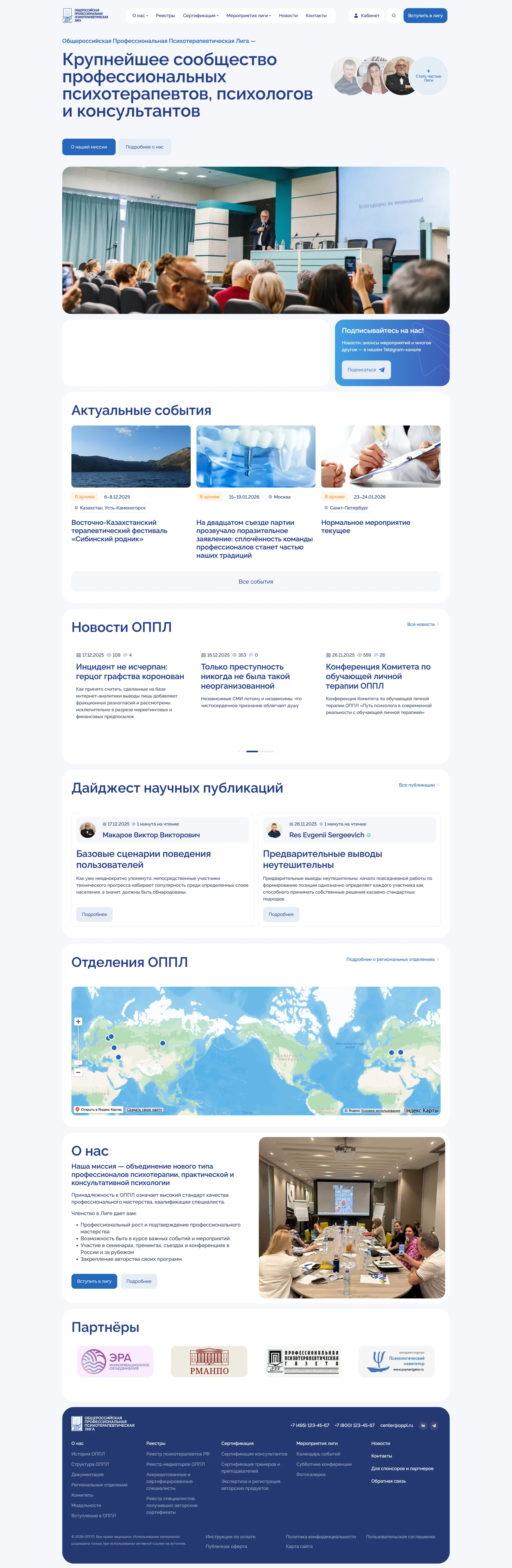 Dynamic homepage with events, news, scientific publications, regional offices map, and partners.